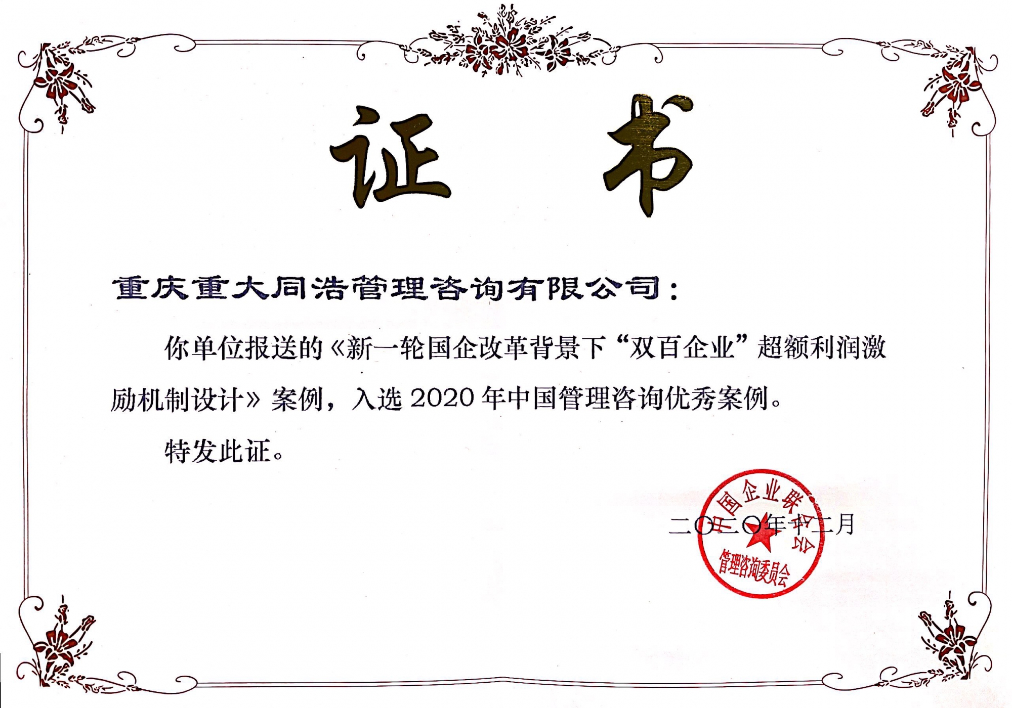 2020年12月,重大同浩負責的《新一輪國企改革背景下“雙百企業(yè)”超額利潤激勵機制設計》、《創(chuàng )新城投公司新時(shí)代高質(zhì)量市場(chǎng)化轉型發(fā)展新樣本》項目成果,成功入選2020年中國管理咨詢(xún)優(yōu)秀案例